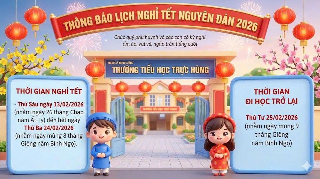 Cũng trong buổi sơ kết, Ban Giám hiệu nhà trường đã thông báo lịch nghỉ Tết Nguyên đán để cán bộ, giáo viên, nhân viên và học sinh chủ động sắp xếp thời gian. Theo đó, học sinh được nghỉ Tết từ ngày 13 tháng 02 năm 2026 đến hết ngày 24 tháng 02 năm 2026; thời gian học tập trở lại vào ngày 25 tháng 02 năm 2026. Nhà trường cũng kính mong phụ huynh quan tâm nhắc nhở con em thực hiện tốt các quy định về an toàn giao thông, phòng chống tai nạn thương tích, giữ gìn sức khỏe và duy trì nề nếp học tập trong kỳ nghỉ.