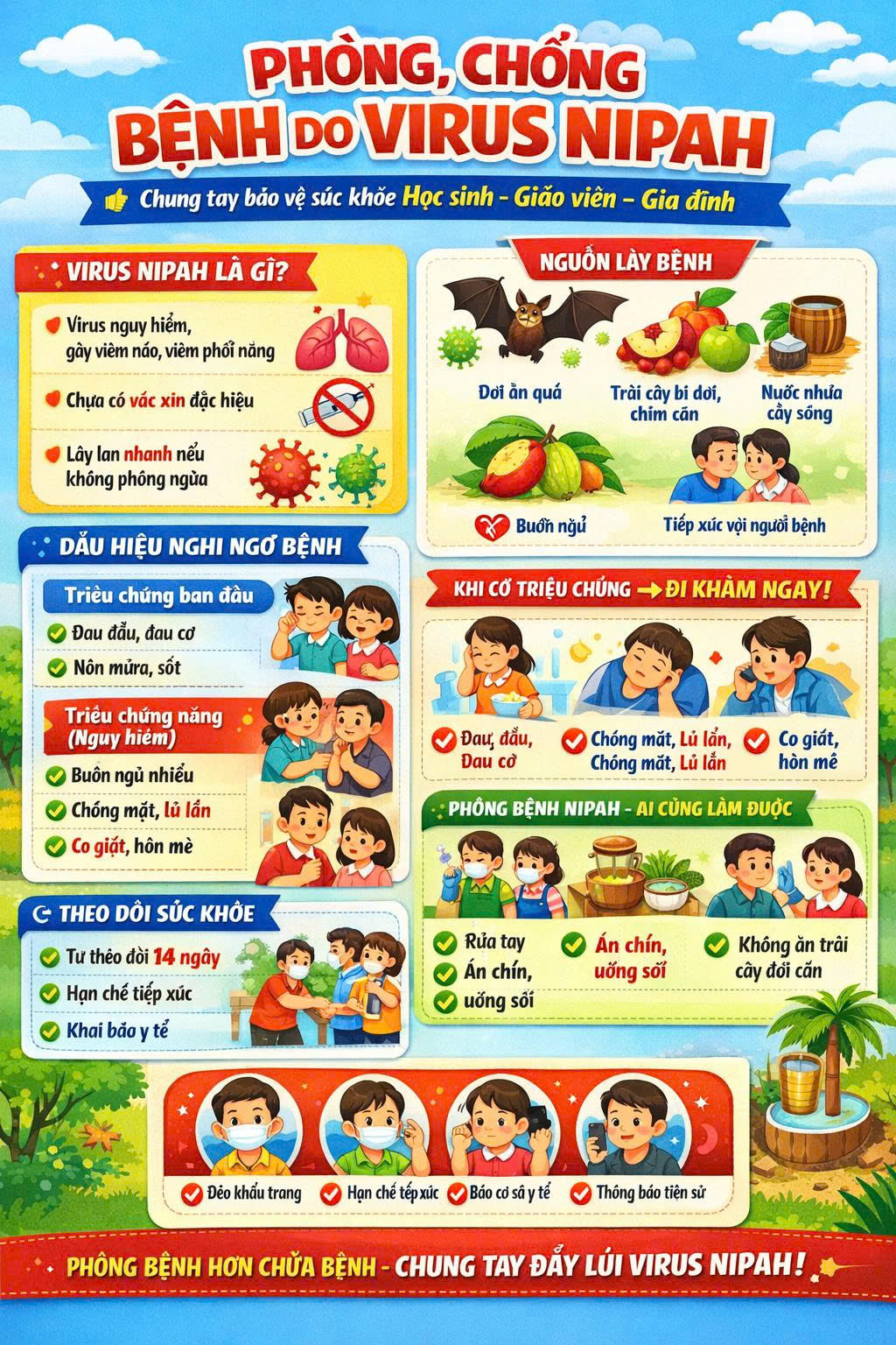 Thực hiện khuyến cáo của Bộ Y tế về công tác phòng, chống dịch bệnh do virus Nipah, nhằm chủ động bảo vệ sức khỏe cho học sinh, gia đình và cộng đồng, nhà trường đã triển khai tuyên truyền đến quý phụ huynh một số nội dung quan trọng cần lưu ý sau: