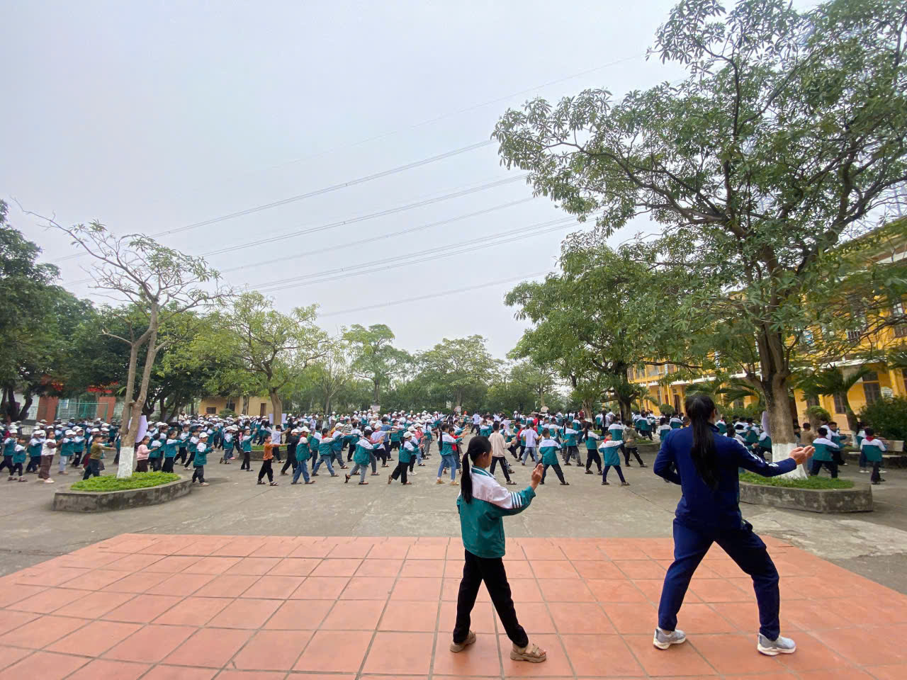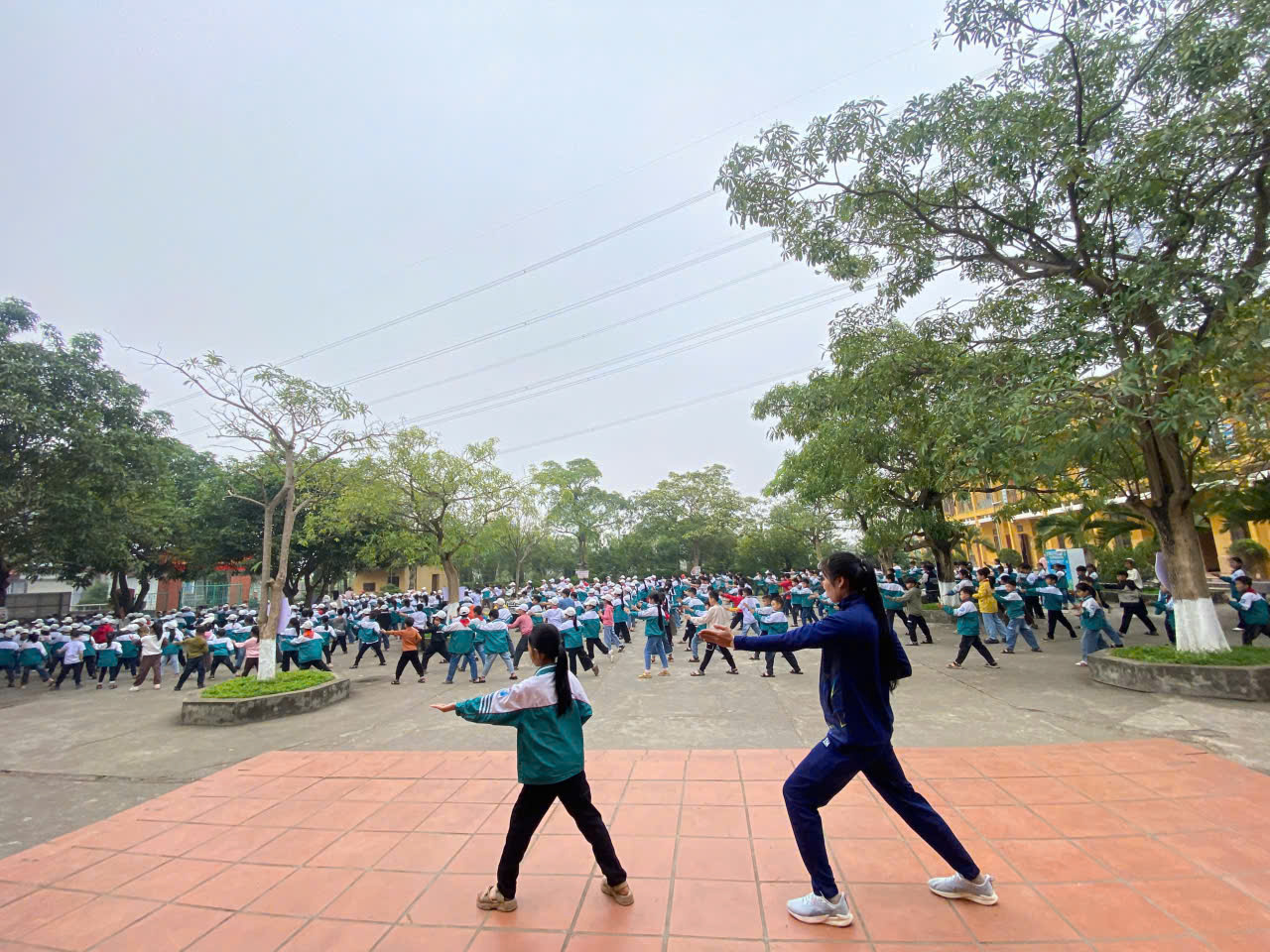 Giáo viên học sinh toàn trường tham gia đồng diễn bài võ nhạc Vovinam và bài thể dục giữa giờ theo đúng hướng dẫn.