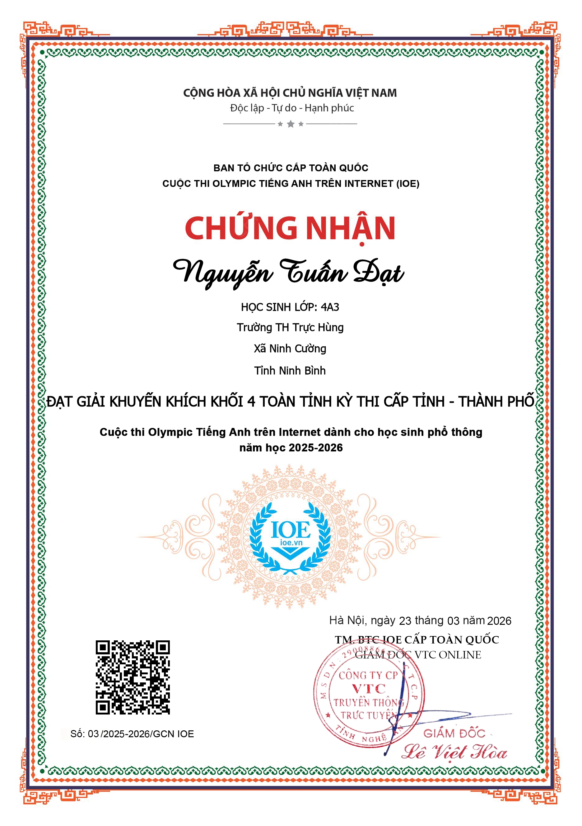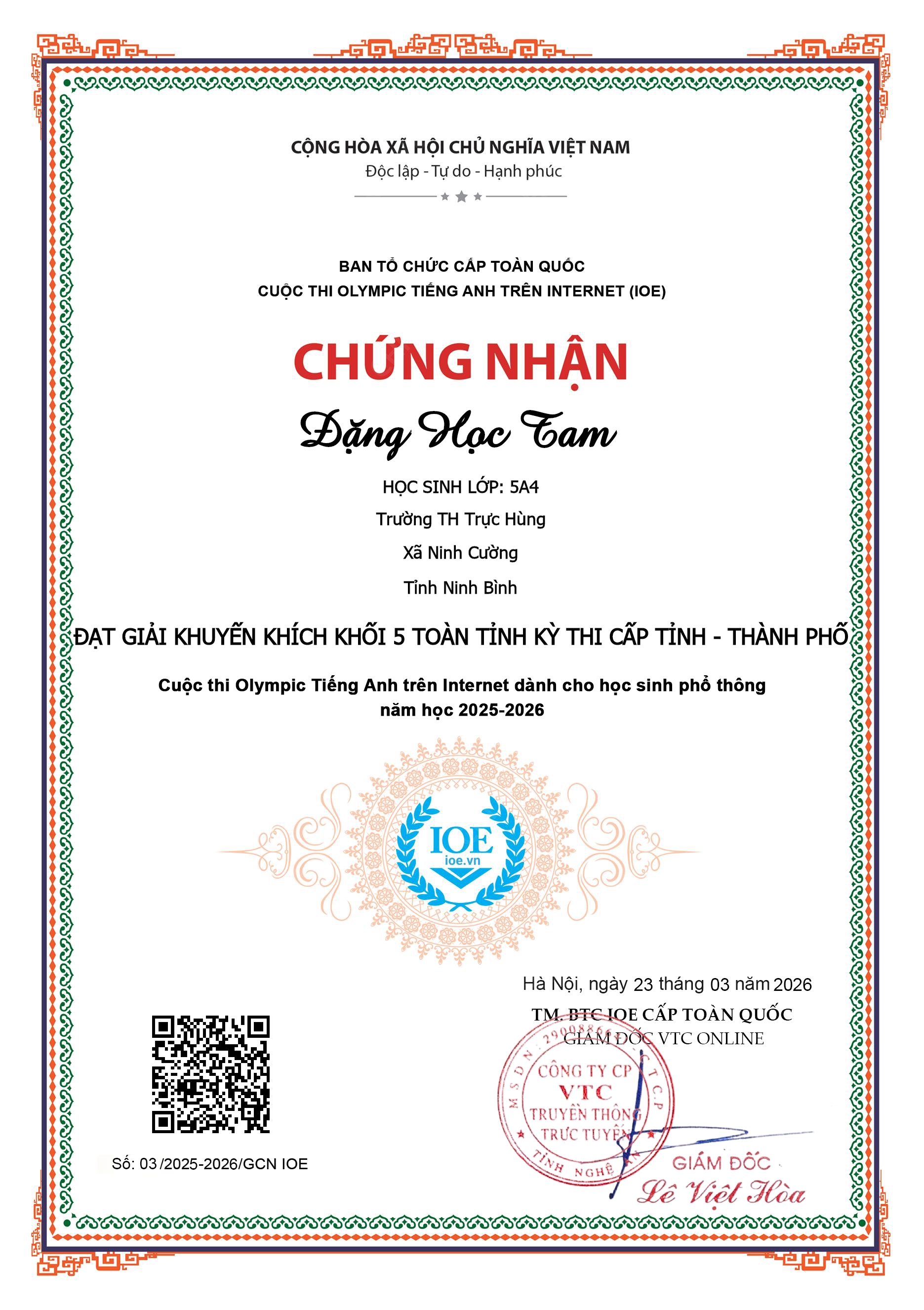 Trong không khí thi đua sôi nổi của năm học, với mục tiêu không ngừng nâng cao chất lượng dạy và học, Trường Tiểu học Trực Hùng luôn chú trọng phát hiện, bồi dưỡng và khích lệ những học sinh có năng lực nổi bật. Trong thời gian qua, nhà trường vui mừng vinh danh các em học sinh Đặng Học Tam lớp 5A4 và Nguyễn Tuấn Đạt lớp 4A3 đã đạt thành tích xuất sắc tại Cuộc thi Olympic Tiếng Anh trên Internet (IOE) cấp tỉnh.