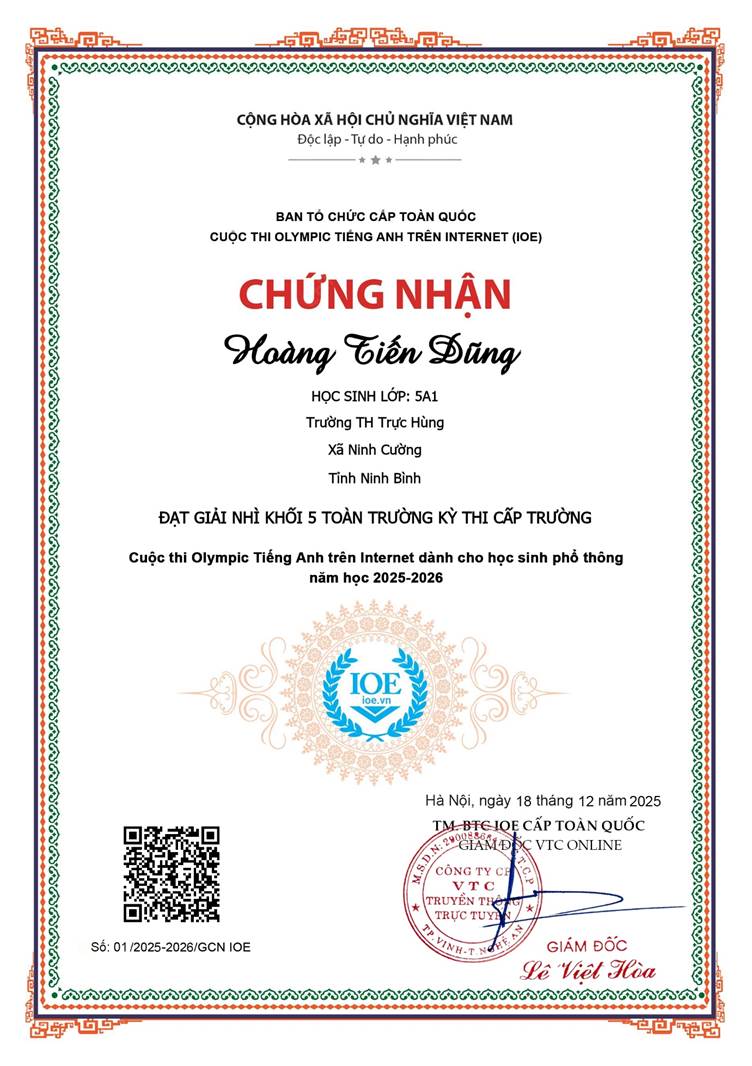 Hưởng ứng phong trào thi đua “Dạy tốt – Học tốt” và đẩy mạnh ứng dụng công nghệ thông tin trong dạy học, Trường Tiểu học Trực Hùng đã tổ chức Cuộc thi Olympic Tiếng Anh trên Internet (IOE) cấp trường năm học 2025 – 2026 dành cho học sinh các khối lớp. Cuộc thi IOE là sân chơi trí tuệ bổ ích, giúp học sinh rèn luyện và phát triển các kỹ năng nghe, đọc, từ vựng và ngữ pháp tiếng Anh thông qua hình thức thi trực tuyến hiện đại. Với tinh thần nghiêm túc, trung thực và quyết tâm cao, các em học sinh Trường Tiểu học Trực Hùng đã tích cực tham gia, thể hiện niềm yêu thích môn học cũng như năng lực ngoại ngữ của bản thân.